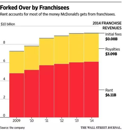 這是雷·克羅克在早期設(shè)計麥當勞的特許經(jīng)營模式時,就留下的一個獨到之處:為了加強控制權(quán),所有門店所需要的土地物業(yè),都要由麥當勞總部出面收購,再轉(zhuǎn)租給特許經(jīng)營商,每年按略低于市場價的水平收購租金。在房地產(chǎn)市場節(jié)節(jié)攀升時,租金收入會水漲船高;而一旦特許經(jīng)營商表現(xiàn)欠佳,也可以隨時將他們“掃地出門”。一些持有麥當勞股票的對沖基金經(jīng)理們甚至曾經(jīng)想過,把麥當勞的餐飲和房地產(chǎn)業(yè)務拆分成兩部分,以便更有效地管理資產(chǎn)。