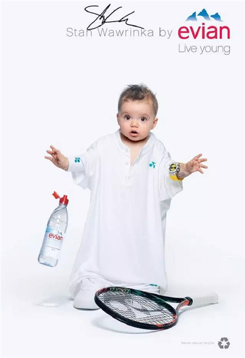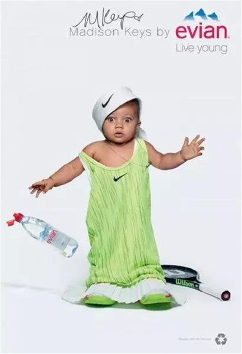 針對(duì)戶外、數(shù)字和社交網(wǎng)絡(luò)的創(chuàng)意則主要集中在一個(gè) Evian Young Team 的概念,一個(gè)由依云代言人莎拉波娃、Stan Wawrinka、Lucas Pouille、Madison Keys 以及高爾夫球員 Lydia Ko 等人組成的團(tuán)隊(duì)來(lái)拍攝廣告的主要視覺:喝了依云水之后,他們都換上一套 Oversize 的運(yùn)動(dòng)服,“變成了嬰兒”。
