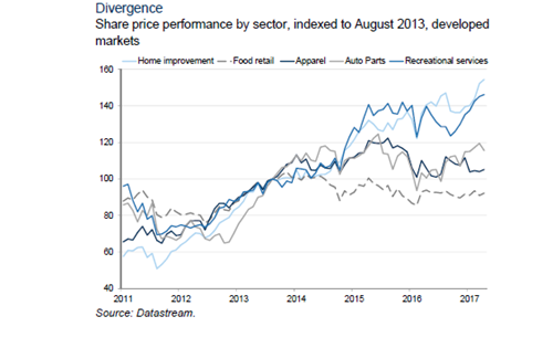 零售商大批破產(chǎn)的同時(shí),一些對(duì)電商“免疫”的行業(yè),在過去幾年表現(xiàn)卻明顯優(yōu)于其他消費(fèi)類行業(yè)。高盛在一篇報(bào)告中總結(jié)了以下四類:1、線下體驗(yàn)型消費(fèi)(如游樂場);2、“大件”商品和服務(wù)(如家具、教育);3、B2B類商品(如工業(yè)零件);4、有監(jiān)管約束的商品(如藥品)。