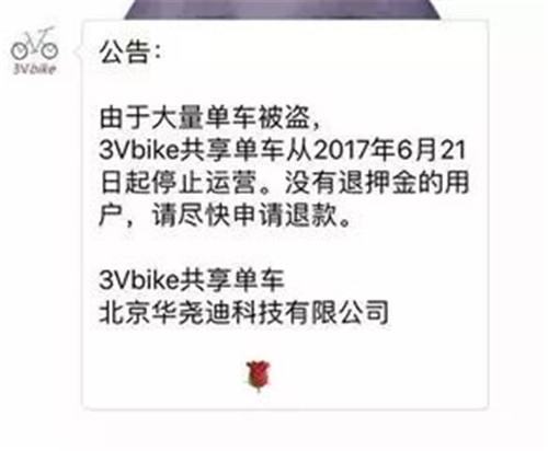 6月21日,共享單車平臺(tái)3Vbike對(duì)外宣布稱,由于單車大量被盜,即日起停止運(yùn)營。并提醒沒有退押金的用戶盡快申請(qǐng)退款。