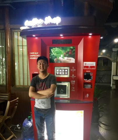 陳述在自己的無人咖啡店和“店員”合影。 鐘欣 攝