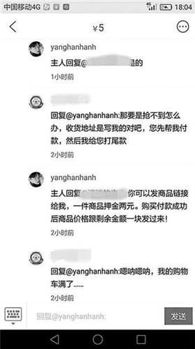 “你到時(shí)候把商品的鏈接給我,然后就是你的收貨地址,每件商品你要給我2塊錢的押金,到了11號那天,我來幫你搶東西,然后付款,沒搶到的話我會退押金,搶到的東西會直接由賣家郵給你,我把交易成功的截圖發(fā)給你之后,你給我付尾款就行了。”這位出租“購物車車位”的商家說,之所以每件商品需要支付2元的押金,是為了防止違約。