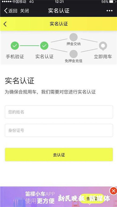 這輛黃色小車車身上貼有二維碼,并寫著“掃碼一元用車”,右側(cè)后輪安裝有四位密碼鎖。小新嘗試掃碼,跟共享單車注冊流程相似,需要手機注冊和實名認(rèn)證。實名認(rèn)證后,則可選擇是否交納押金,按提示說明,兩者在后續(xù)使用費用上存在差異,交納99元押金后的使用價格便宜一些,半小時1元。