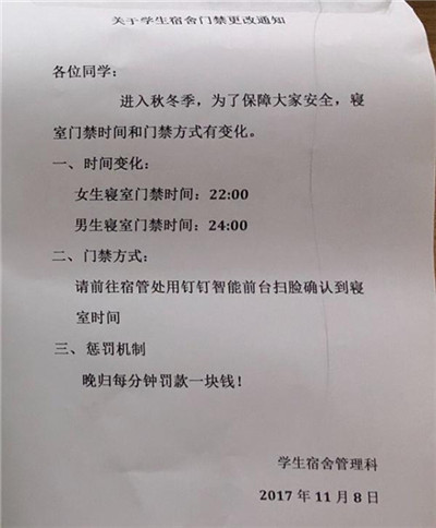 近日,有杭州某高校學(xué)生爆料,杭州某大學(xué)宿舍管理處為管理學(xué)生寢室門禁,引入人臉識別簽到,要求女生在晚上10點前回宿舍,晚到一分鐘罰款1塊錢,而男生竟然可以晚兩小時。