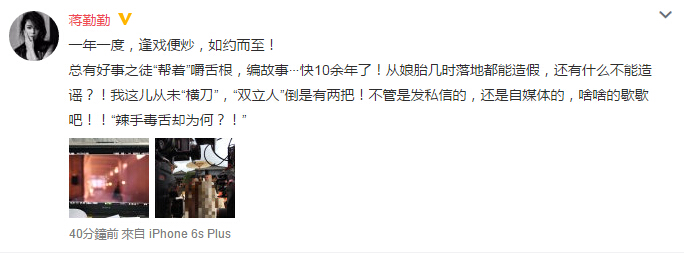被指小三奪愛(ài) 蔣勤勤怒斥造謠者:歇歇吧!