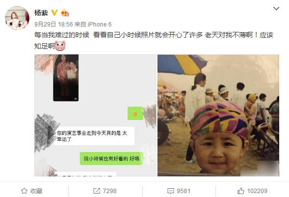 9月29日,楊紫曬出兩張照片,一張為聊天的截圖,一張為楊紫小時候的照片,楊紫寫道:“每當(dāng)我難過的時候,看看自己小時候照片就會開心了許多。老天對我不薄??!應(yīng)該知足啊?!?/p>