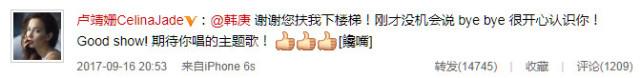 去年9月16日,第31屆金雞獎(jiǎng)舉行頒獎(jiǎng)典禮,盧靖姍曾與韓庚搭檔頒發(fā)最佳音樂獎(jiǎng),同臺(tái)互動(dòng)。下樓梯時(shí),韓庚細(xì)心地扶著盧靖姍,非常紳士。事后,盧靖姍還發(fā)微博專門感謝韓庚。