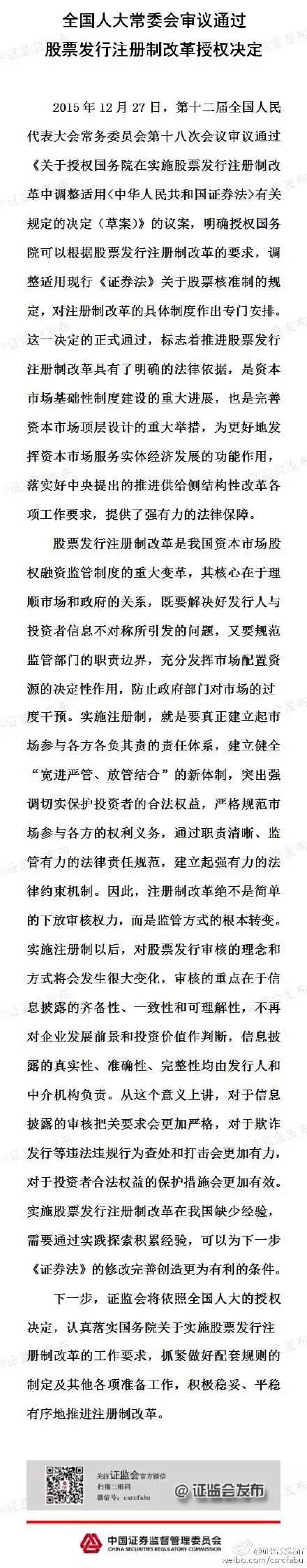 證監(jiān)會官方微博27日傍晚發(fā)布信息,稱全國人大常委會審議通過股票發(fā)行注冊制改革授權(quán)決定,下一步,證監(jiān)會將積極穩(wěn)妥、平穩(wěn)有序地推進注冊制改革。