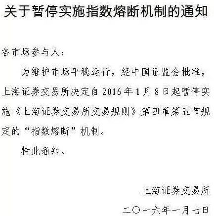 1月7日當(dāng)晚,上交所、深交所及中金所聯(lián)合發(fā)布通知稱決定暫停實(shí)施制度熔斷機(jī)制?!敖?jīng)中國(guó)證監(jiān)會(huì)同意,上交所、深交所及中金所決定于1月8日起暫停實(shí)施指數(shù)熔斷相關(guān)規(guī)定。”