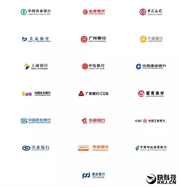 中國(guó)銀行、中國(guó)農(nóng)業(yè)銀行、中國(guó)工商銀行、中國(guó)建設(shè)銀行、招商銀行、中信銀行、浦發(fā)銀行、興業(yè)銀行、廣發(fā)銀行、廣州銀行、上海銀行、平安銀行、中國(guó)民生銀行、中國(guó)光大銀行、中國(guó)郵政儲(chǔ)蓄銀行、交通銀行、北京銀行、寧波銀行、華夏銀行。