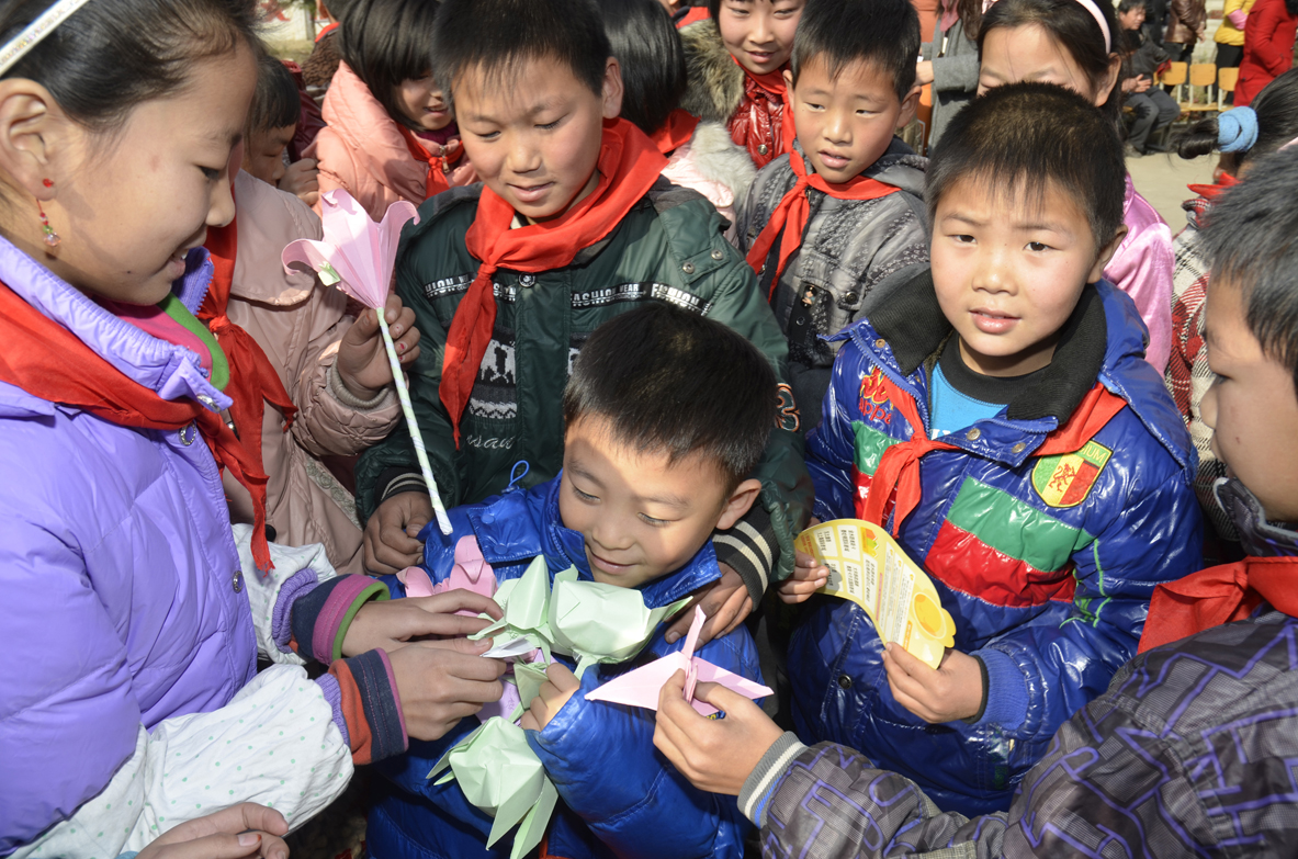 活動結(jié)束后,懂得感恩的學(xué)生現(xiàn)場為愛心車友演唱了《感恩的心》,并為城里的小朋友送上了自己疊的千紙鶴、百合花等折紙,善良淳樸的孩子還為城里的小朋友送上了山里的土特產(chǎn),花生、紅薯、蓮藕等,一袋袋的塞到小朋友手里,在場的家長看到,感慨的說:“山里孩子很純真、很善良。”
