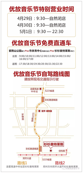 鄭州火車站:乘坐地鐵1號線至市體育中心站,可以在紫荊山公園西門,乘坐優(yōu)放音樂節(jié)免費(fèi)班車。