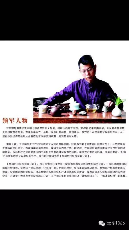 甘田茶葉董事長王互相先生,是近年來普洱茶領(lǐng)域的傳奇人物之一,從事普洱茶產(chǎn)業(yè)研究二十余年,積累并沉淀了豐厚的普洱茶知識(shí)和經(jīng)驗(yàn)。長年累月地深入云南省的各大普洱茶產(chǎn)區(qū)調(diào)研,被業(yè)界冠以“普洱原料王”“鬼才拼配師”等美譽(yù)。王互相先生早年曾是國內(nèi)某大型普洱茶企業(yè)的高級管理人員,工作多年后,鑒于對普洱茶產(chǎn)業(yè)的獨(dú)到見解,成立了以原料收購和批發(fā)為主的“御貢茶葉”,為多家知名茶企提供原料支持地,深受業(yè)界好評,后經(jīng)十年發(fā)展,于2011年重新創(chuàng)建了以成品為主,多元化經(jīng)營模式的“昆明甘田經(jīng)貿(mào)有限公司”。