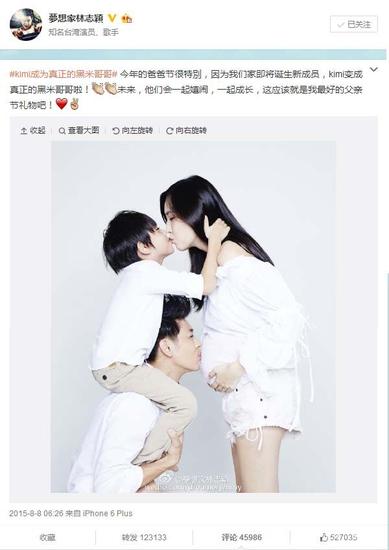 2015年8月8日林志穎發(fā)微博宣布陳若儀再次懷孕,一家三口的溫馨合照簡直太有愛。