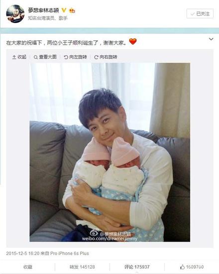 12月5日,林志穎發(fā)微博宣布自己又有了兩個兒子,眼神里滿是父愛。陳若儀完勝那個睡了偶像的妹子好不好,她直接給偶像生了三只猴子!哦不,是三個兒子。