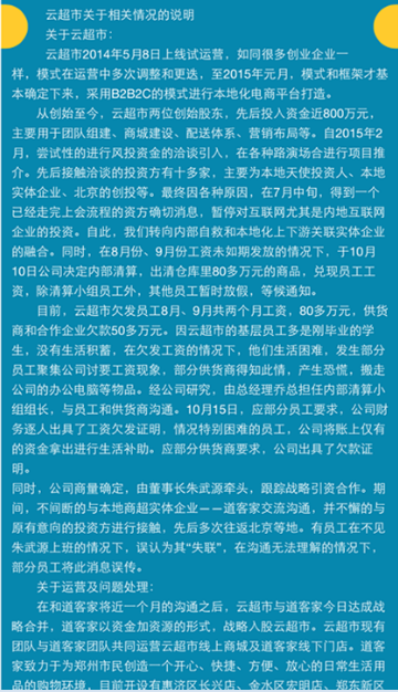 最近一周,在鄭州電商圈悄悄地流傳著這個(gè)消息……云超市倒閉了?董事長朱武源失聯(lián)了?讓我們看一下26號各媒體發(fā)出的消息:
