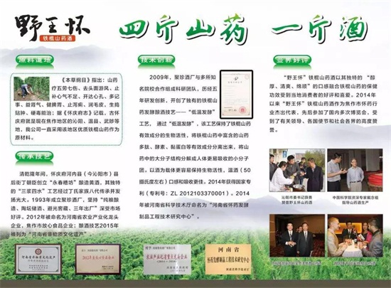 沁陽市野王懷氏生物科技現(xiàn)任總經(jīng)理丁向峰(聚珍酒廠第七代傳人)在生產(chǎn)過程中除嚴(yán)格遵循家傳古方外,通過產(chǎn)學(xué)研與河南科技大學(xué)、天津科技大學(xué),河南中醫(yī)學(xué)院合作,聘請(qǐng)國內(nèi)數(shù)名專家教授組成科研團(tuán)隊(duì),依據(jù)當(dāng)?shù)厥a(chǎn)“鐵棍山藥”的資源優(yōu)勢(shì),采用低溫發(fā)酵技術(shù)研發(fā)出了鐵棍山藥酒,使鐵棍山藥的有效吸收率達(dá)到90%以上。大大提高了鐵棍山藥酒的健康保健價(jià)值。