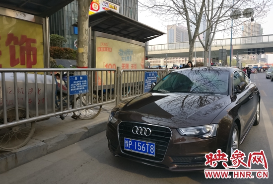 下午3時許,記者在花園路國貿(mào)360商場門前的公交站牌看到,多輛出租車和私家車將整座公交站停滿,而公交車迫于無奈只能在路中間???。一輛車牌號為豫AS578W的機動車司機在民警的勸說之下駛離了公交站,而另一輛車牌號為豫PI56T8的機動車同樣停在公交站,因車內(nèi)無人,民警對其進行了處罰。