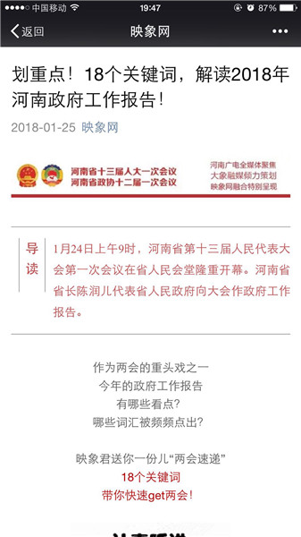 映象網(wǎng)官方微信策劃推出原創(chuàng)策劃《河南人,2018給你穩(wěn)穩(wěn)的幸福!》、《你好,我是河南!這是我的五年成績單,請接收!》、《2018年,河南都有哪些“小目標”?》、《劃重點!18個關(guān)鍵詞,解讀2018年河南政府工作報告!》。每篇都刷屏朋友圈,網(wǎng)友積極轉(zhuǎn)發(fā)點贊,稱“看完真的覺著穩(wěn)穩(wěn)的幸?!?。