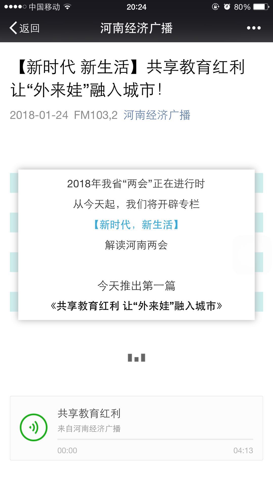 河南經(jīng)濟廣播推出兩會專欄“新時代 新生活”,推出五篇深度報道:《共享教育紅利 讓“外來娃”融入城市!》、《藍天白云下的大數(shù)據(jù)“護衛(wèi)隊”!》、《讓家庭醫(yī)生打通分級診療“最后一公里”》、《加大住房保障力度,圓百姓安居夢!》、《扎根中原大地,“創(chuàng)”出美好未來!》,總時長25分鐘。這一組報道用“講故事說新聞”的方式,關(guān)注隨遷子女享有與城市學(xué)生一樣的高品質(zhì)教育、環(huán)保技術(shù)革新、返鄉(xiāng)下鄉(xiāng)創(chuàng)業(yè)扶貧、保障房建設(shè)、生態(tài)文明等熱點民生話題,每期采訪都做到聲音全面、數(shù)據(jù)詳實、人物典型、立意深遠,通過對代表、委員建議、對話部門、基層聲音等四個方面,對熱點話題報道做到有“廣度 高度 深度 溫度”。