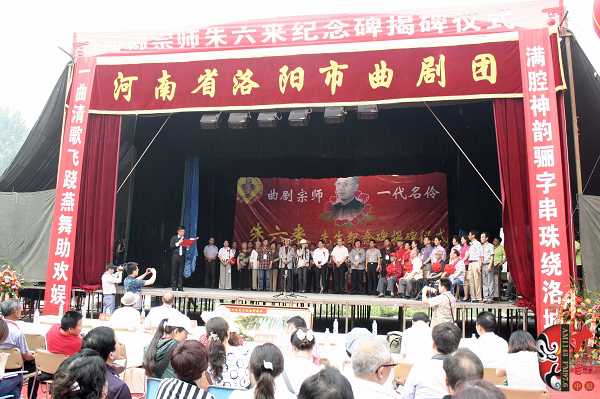 5月9日,由河南省藝術研究院、省戲劇家協會、省戲曲表演學會、洛陽市文廣新局、洛陽市戲劇家協會、洛陽市曲劇院主辦的,曲劇宗師?一代名伶朱六來先生紀念碑揭碑儀式在其故里洛陽市關林鎮(zhèn)大東村舉行。來自省內的著名戲劇評論家、劇作家馬紫晨,河南省藝術研究院院長方可杰,戲劇評論家譚靜波,曲劇老藝術家劉衛(wèi)生、馬騏、牛長欣、高桂枝、郭鳳娥等,以及各地市兄弟院團代表參加了本次揭碑儀式。同時,著名曲劇表演藝術家“曲劇泰斗”馬騏,有南牛北馬之稱的南牛著名曲劇表演藝術家牛長欣,以及各兄弟院團的著名演員獻上了精彩的專場演出。