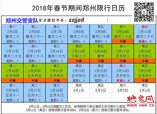 映象網(wǎng)訊(記者 秦雯)2018年春節(jié)長假從2月15日開始至2月21日結(jié)束,共7天,春節(jié)將至,為了確保在市民人流、車流、物流最密集的時段可以安全出行。2月5日,記者從鄭州市交警支隊了解到:2月15日至2月21日春節(jié)七天長假期間,鄭州市區(qū)三環(huán)以內(nèi)所有機動車尾號不限行,但2月11日(星期日)、2月24日(星期六)上班,因法定節(jié)假日放假調(diào)休而調(diào)整為上班的周六、周日,按對應調(diào)休的工作日限行,因此2月11日(周日)按周四限行規(guī)定,限行尾號4和9;2月24日(周六)按周三限行規(guī)定,限行尾號3和8。