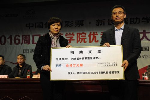 2016年12月7日、8日,中國體育彩票品牌公益項目“中國體育彩票新長城助學基金”2016年捐贈儀式分別在商丘師范學院和周口師范學院舉行。據(jù)悉,通過此次捐贈活動,河南省體育彩票管理中心共向兩個學校來自全國14省區(qū)的120名優(yōu)秀貧困大學生每人捐助5000元,幫助他們和他們的家庭,減輕學習生活中的經(jīng)濟負擔。