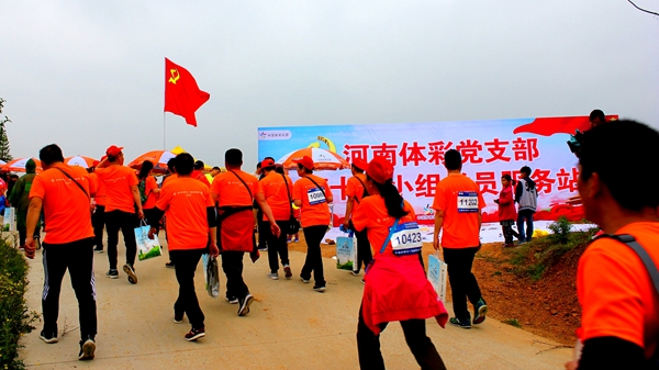 參賽者路過(guò)“河南體彩黨支部第十四小組黨員服務(wù)站”