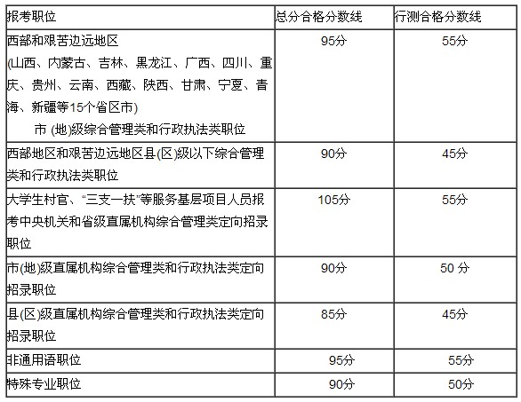 其中,西部地區(qū)和艱苦邊遠地區(qū)綜合管理類和行政執(zhí)法類職位的合格分數(shù)線總分不低于95分,且行測不低于55分。非通用語職位的合格分數(shù)線總分不低于95分,且行測不低于55分。特殊專業(yè)職位的合格分數(shù)線總分不低于90分,且行測不低于50分。銀監(jiān)會、證監(jiān)會特殊專業(yè)職位專業(yè)科目考試不低于50分。
