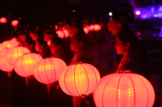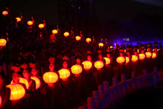 尾聲時(shí),伴隨著一曲《水調(diào)歌頭》,寄托大家心中的美好,這時(shí),無(wú)數(shù)盞紅色燈籠由少女們舉過(guò)頭頂,緩緩步入舞臺(tái)中央,形成一個(gè)巨大的月亮造型,柔和、寧?kù)o,與遠(yuǎn)處的廊橋樓閣共同組成一幅壯觀的景象,令人回味悠長(zhǎng)。