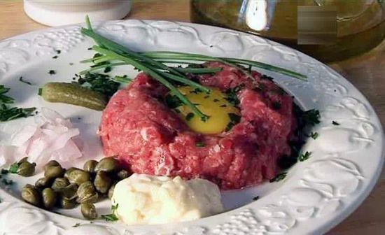 實(shí)際情況:純生牛肉末,配各種口味詭異的香料,再攪和上一個(gè)純生雞蛋。
