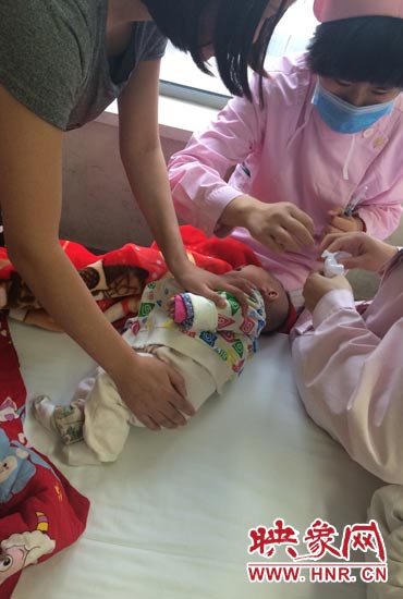 由于持續(xù)高燒,護(hù)士正在對(duì)大寶抽血化驗(yàn)。