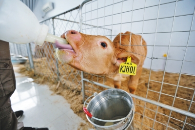 技術(shù)員呂博說,小牛犢們也是一日三餐,每次喂2公斤奶粉外,還加些犢牛顆粒飼料和干草。預(yù)計(jì)3個(gè)月大后,將逐步給它們斷奶。