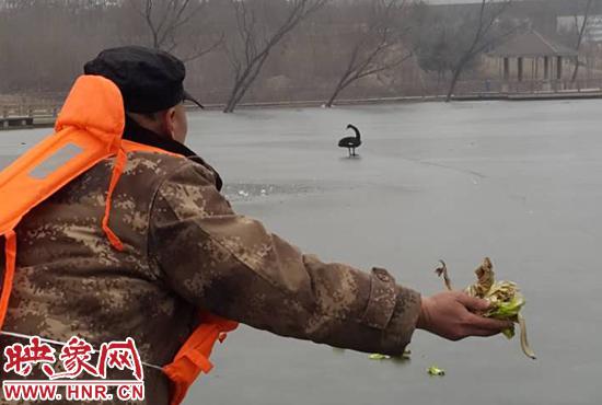 黑天鵝飛入西流湖被困 工作人員破冰送吃的