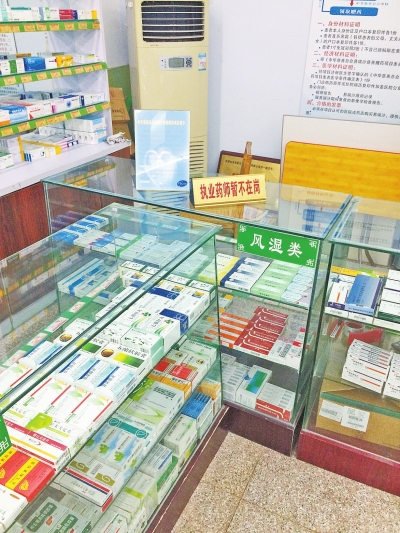 像這樣擺出“執(zhí)業(yè)藥師暫不在崗”的藥店不在少數(shù)