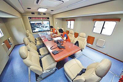 該車整車自重16噸,在車輛內(nèi)部,有一個近20平方米的會議室,能同時坐下十多人。