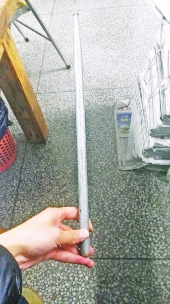 隨后,記者見到了校方提供的打?qū)W生的工具,是一個(gè)鼓槌,外表涂有銀色的漆,看起來(lái)像是鐵質(zhì)的,校方稱學(xué)校沒有鋼管類的教鞭等。