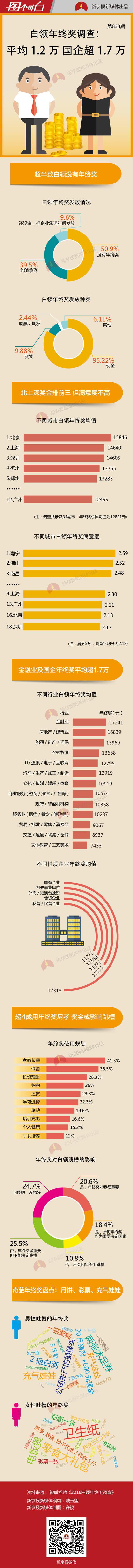 春節(jié)將至,“年終獎(jiǎng)”又成了眾人關(guān)注的話題。近日,智聯(lián)招聘發(fā)布《2016白領(lǐng)年終獎(jiǎng)?wù){(diào)查》,調(diào)查通過(guò)對(duì)11526份有效問(wèn)卷分析顯示,涉及的34城市年終獎(jiǎng)總體均值為12821元。其中,北京最高,為15846元,上海和深圳次之。不過(guò),三個(gè)城市的白領(lǐng)對(duì)年終獎(jiǎng)的滿意度并不是很高。
