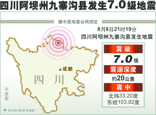 8月8日21時(shí)19分49秒,阿壩州九寨溝縣(東經(jīng)103.82度、北緯33.20度)發(fā)生7.0級地震,震源深度約20公里。