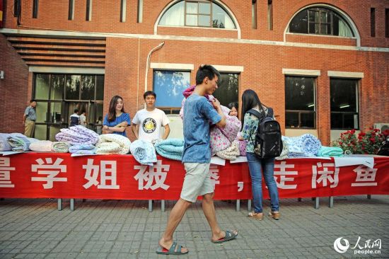 2015年05月31日,北京,清華大學(xué),今年即將畢業(yè)回國的韓國女生李惠林正在參與買被子。高價(jià)被子的主人是清華大學(xué)工藝美術(shù)系的一名留學(xué)生李惠林,現(xiàn)年大四的她畢業(yè)后將要回韓國,于是將大部分不便攜帶的生活物品都賣給了龍一, 除了被子,還有書和化妝品。