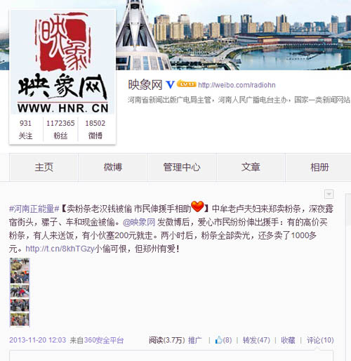 “老漢錢被盜,鄭州市民網(wǎng)友義買粉條”微博發(fā)布于2013年11月19日,當(dāng)天,映象網(wǎng)記者在街頭采訪,偶遇中牟縣的一位農(nóng)家老漢與老伴到鄭州賣粉條,不料騾子被偷,錢也被盜。映象網(wǎng)迅速發(fā)布新聞,并連續(xù)發(fā)布多條微博,呼吁市民網(wǎng)友伸出援手幫助兩位老人,迅速引發(fā)關(guān)注,短時(shí)間內(nèi)轉(zhuǎn)發(fā)量超過200次,閱讀量接近20萬次,引發(fā)眾多愛心市民網(wǎng)友前往購買粉條,400多斤粉條在兩個(gè)小時(shí)內(nèi)被搶購一空,丟失的騾子也成功找回。