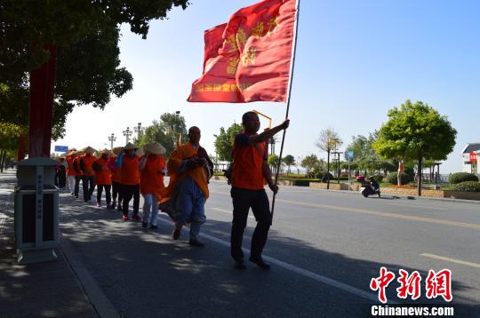 圖為朝圣團(tuán)一行30人在少林寺延偵法師、延宗法師的帶領(lǐng)下,徒步行腳。 少林寺供圖 攝圖為朝圣團(tuán)一行30人在少林寺延偵法師、延宗法師的帶領(lǐng)下,徒步行腳?!∩倭炙鹿﹫D 攝