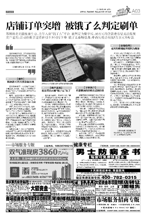4月16日,《河南商報》以《店鋪訂單突增 被餓了么判定刷單》為題,對老劉10萬多元的交易款被凍結(jié)一事進(jìn)行報道,“餓了么”市場經(jīng)理潘先生稱,因為連續(xù)多天多個手機(jī)號在老劉店鋪下單,系統(tǒng)判斷為商家刷單,套取“餓了么”給用戶的補(bǔ)貼,所以將老劉的賬戶貨款凍結(jié)了。