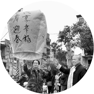近日,臺(tái)灣毫芒雕刻家陳逢顯(右)與傳統(tǒng)天燈工藝大師林國(guó)和(左)一起放飛寫(xiě)有“兩岸迎春· 共享幸福”的天燈。新北市平溪區(qū)放天燈久負(fù)盛名,已有百余年歷史。 王東明攝