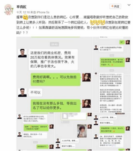 6月6日,某酒吧駐唱女歌手通過自己的微博發(fā)布了幾張聊天截圖。截圖內(nèi)容也是著實讓大家大吃一驚。聊天內(nèi)容大意是酒吧駐唱女歌手找了一位可以網(wǎng)紅經(jīng)紀(jì)人,期望他能夠把自己炒成網(wǎng)絡(luò)紅人,而每次推成功一次紅人,大概費(fèi)用至少是20萬起。該網(wǎng)紅經(jīng)理自稱打造網(wǎng)紅每月收入百萬。
