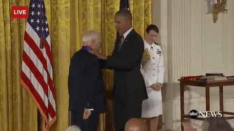 據(jù)報道,老藝術(shù)家Mel Brooks今天進(jìn)白宮接受“National Medal of Arts”,奧巴馬往他脖子上掛獎?wù)碌臅r候,這個90歲的老頑童做勢要脫奧巴馬的褲子,給總統(tǒng)嚇了一趔趄。