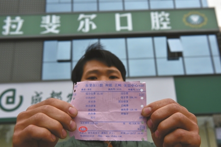 26歲的小姜在成都工作,住在姐姐家。一顆緊靠盡頭牙的左下牙把小姜折磨了近一年,平日他只是弄點含片“對付對付”。10月27日,小姜終于決定“來個徹底根治”。當(dāng)天下午1點過,他問姐姐要了300塊錢后,來到位于高新區(qū)府城大道的拉斐爾口腔醫(yī)院。