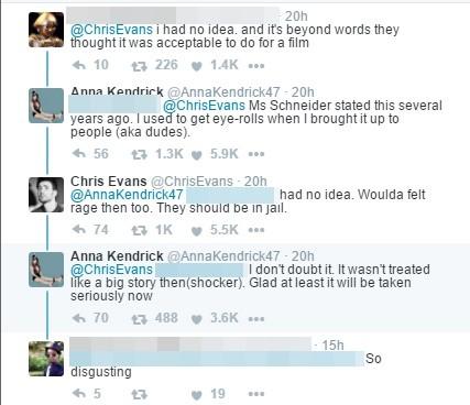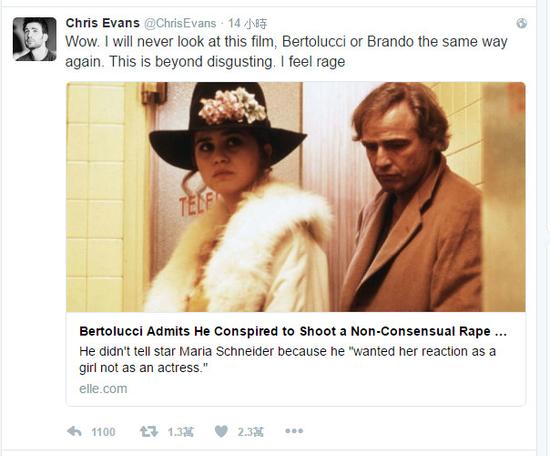 《美國隊(duì)長》克里斯·埃文斯(Chris Evans)也表示:“天啊,我再也無法像過去那樣看待這部片子、貝托魯奇或白蘭度,這已經(jīng)超越了惡心,我覺得很憤怒!”他的發(fā)文也引來許多網(wǎng)友認(rèn)同,連《歌喉贊》女主角安娜·肯德里克(Anna Kendrick)也在底下回應(yīng)表示,“施耐德女士之前曾在訪談中說過,‘我曾提起過這件事情,聽的人(男人們)還翻白眼’?!?/p>