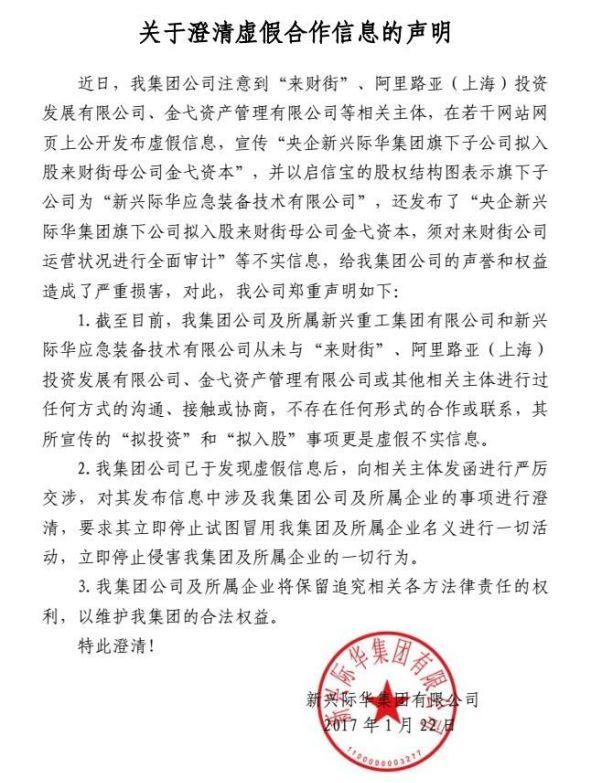 對(duì)于這一“抱大腿”的行為,新興際華1月22日在其官網(wǎng)發(fā)布《關(guān)于澄清虛假合作信息的聲明》,稱“央企新興際華集團(tuán)旗下公司擬入股金戈資本,須對(duì)來(lái)財(cái)街公司運(yùn)營(yíng)狀況進(jìn)行全面審計(jì)”為不實(shí)信息,并聲明新興際華及其所屬新興重工集團(tuán)有限公司、新興際華應(yīng)急裝備技術(shù)有限公司從未與來(lái)財(cái)街、阿里路亞(上海)投資發(fā)展有限公司、金戈資產(chǎn)管理有限公司進(jìn)行過(guò)任何方式的溝通、接觸或協(xié)商,不存在任何形式的合作或聯(lián)系。