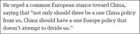 他說(shuō):“不能只是要求我們堅(jiān)持一個(gè)中國(guó)原則;中國(guó)也應(yīng)當(dāng)堅(jiān)持一個(gè)歐洲的立場(chǎng),不能試圖分裂我們。”